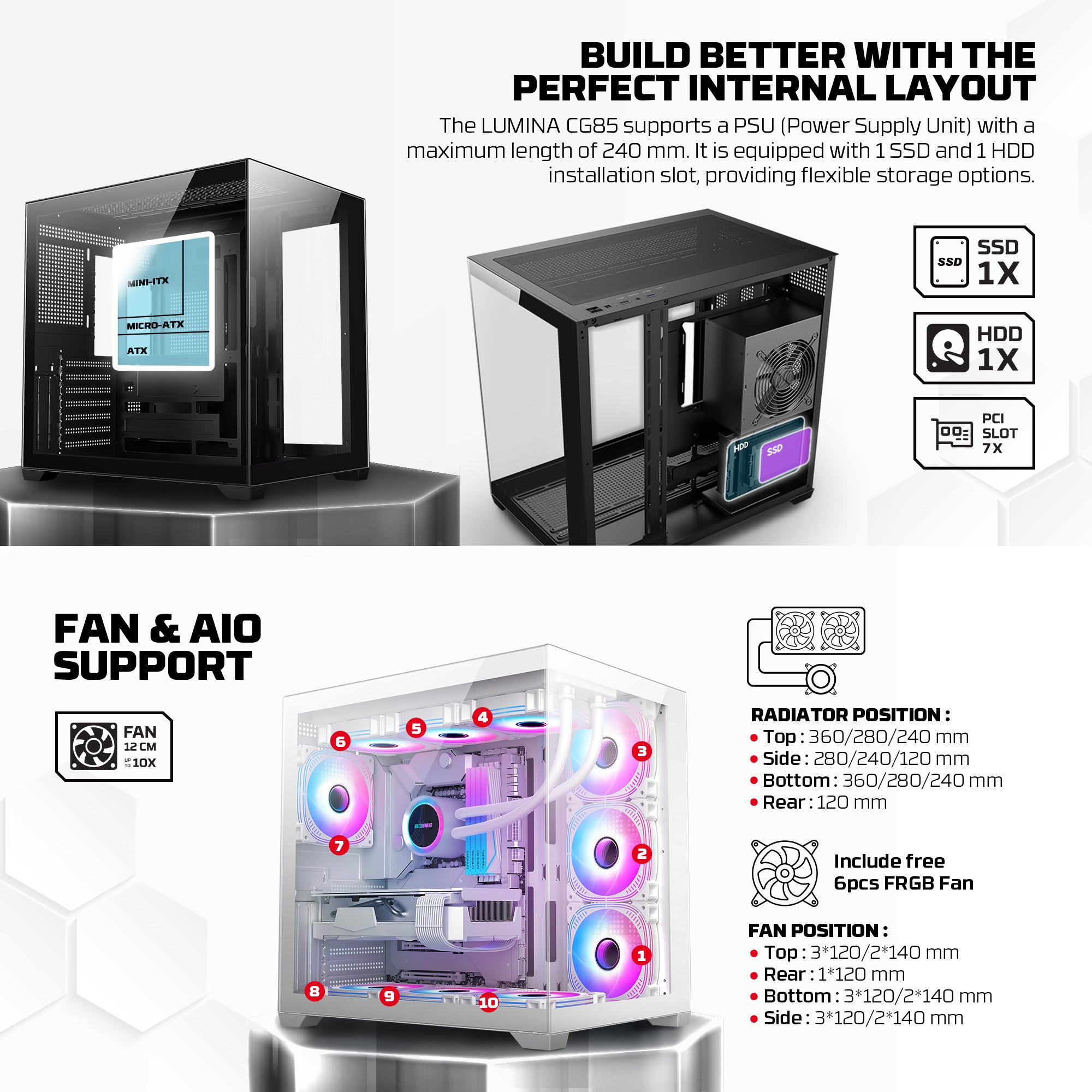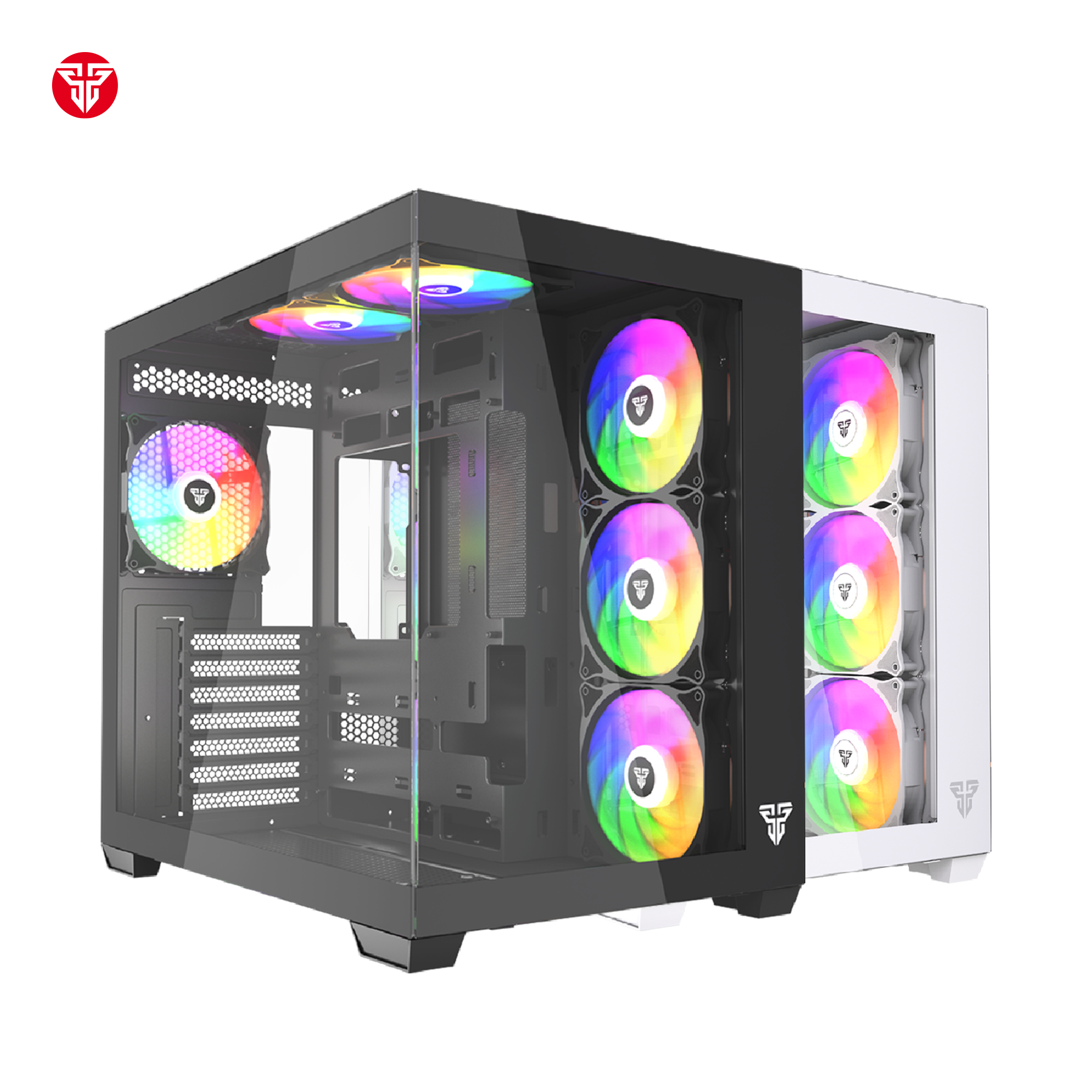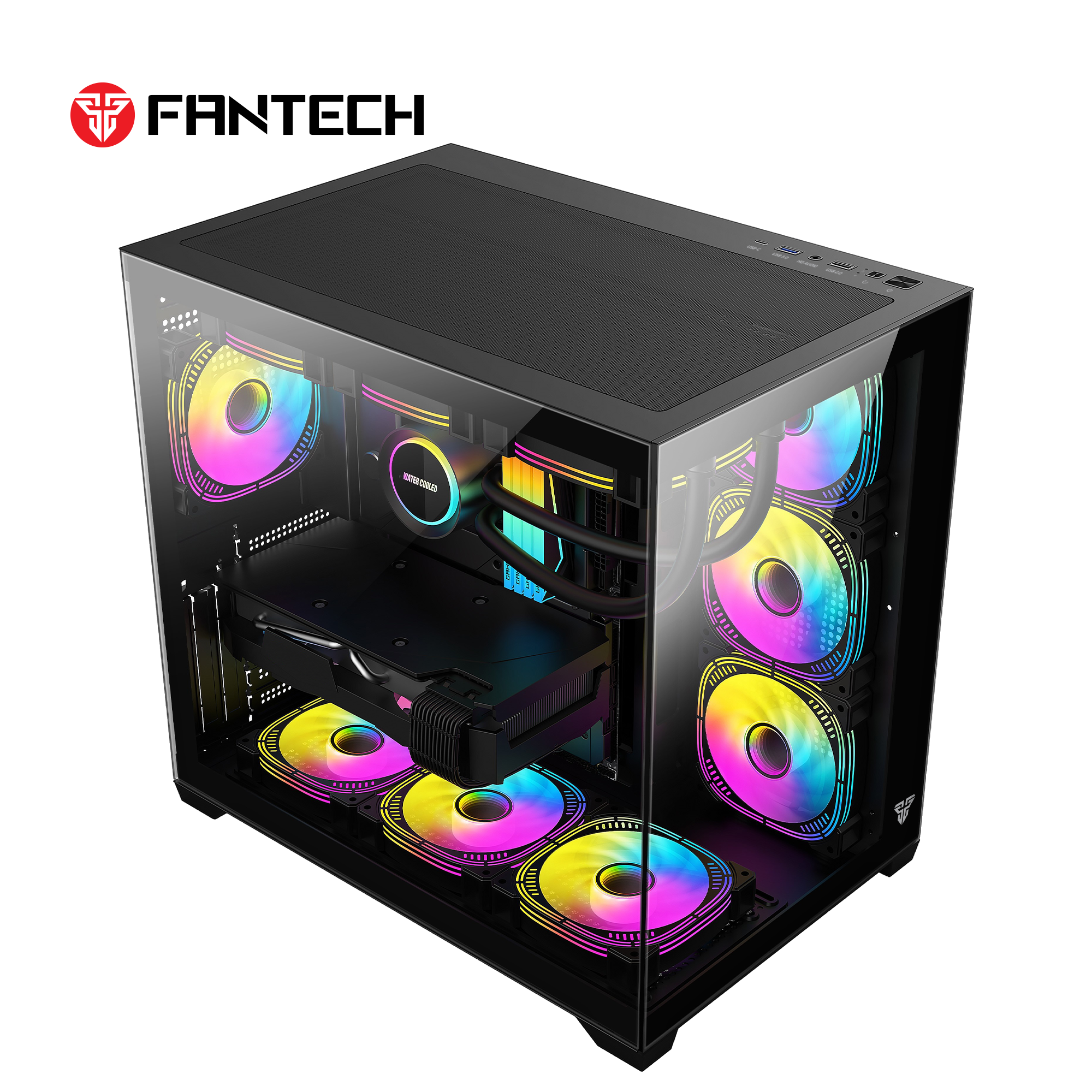 Fantech CG85 Lumina عبارة عن حقيبة ألعاب أنيقة متوسطة الحجم تتميز بشاشة زجاجية بانورامية بزاوية 270 درجة و6 مراوح ARGB مثبتة مسبقًا وتصميم مزدوج الغرفة. وهو يدعم اللوحات الأم ATX، وMicro-ATX، وMini-ITX، مما يوفر مساحة واسعة للمكونات عالية الأداء، بما في ذلك \(400\text{mm}\) وحدات معالجة الرسومات و\(175\text{mm}\) مبردات وحدة المعالجة المركزية. الميزات والمواصفات الرئيسية: التصميم: عرض بانورامي 270 درجة مع ألواح أمامية وجانبية من الزجاج المقسى. التبريد: يتضمن 6 مراوح ARGB مثبتة مسبقًا لتدفق هواء ديناميكي محسّن. التوافق: يدعم اللوحات الأم ATX وMicro-ATX وMini-ITX. التصريح: يدعم أطوال وحدة معالجة الرسومات حتى \(400\text{mm}\) وارتفاع مبرد وحدة المعالجة المركزية حتى \(175\text{mm}\).I/O اللوحة: تتضمن 1x USB 3.1 Gen1 Type-C، 1x USB 3.0، 1x USB 2.0، وصوت عالي الدقة. التخزين والإدارة: 1x 2.5 بوصة، فتحة محرك 1x 3.5 بوصة، ومساحة إدارة الكابلات 32 مم. الأبعاد والوزن: \(420\مرات 285\مرات 400\نص{مم}\)، الوزن 5.9 كجم. تم تصميم العلبة للبنيات عالية الأداء، مما يوفر مظهرًا جماليًا عصريًا وتبريدًا ممتازًا وإدارة سهلة للكابلات.
