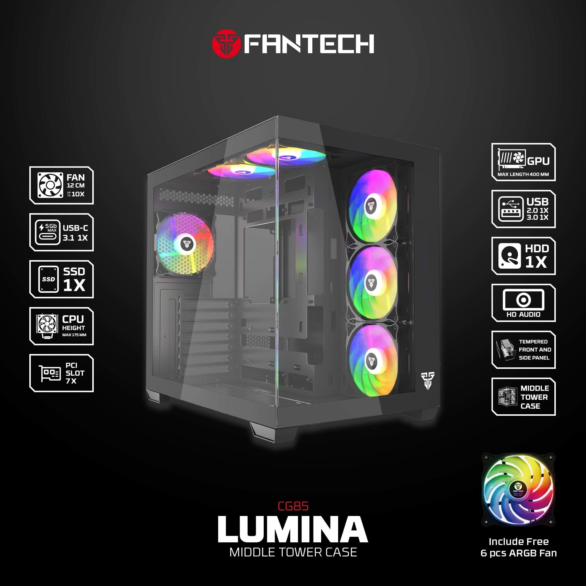 حقيبة الألعاب Fantech CG85 LUMINA MID Tower - أسود