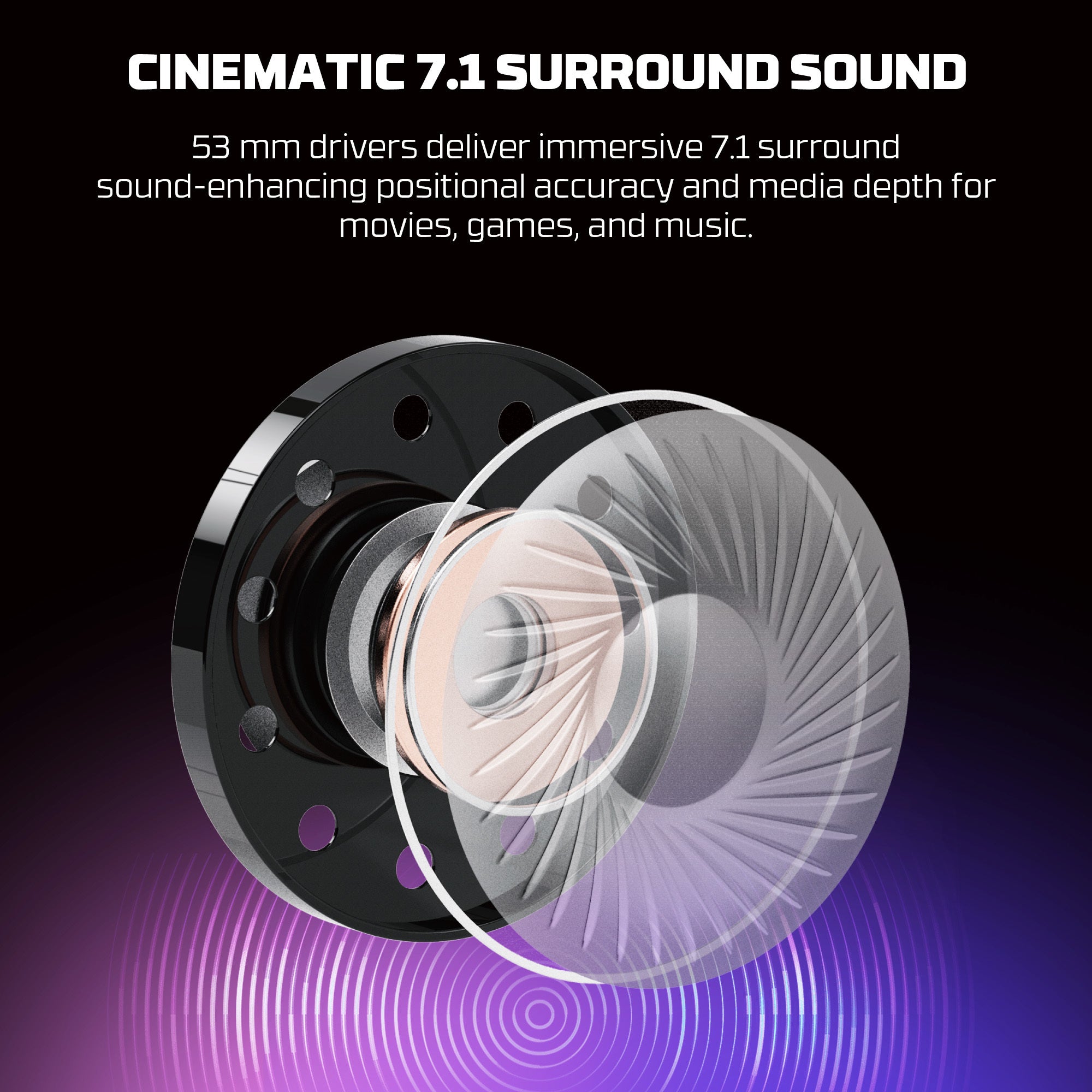 الأداء الصوتي: توفر برامج التشغيل مقاس 53 مم صوتًا عميقًا وواضحًا، بينما يعمل الصوت المحيطي الافتراضي 7.1 على زيادة الدقة الموضعية للألعاب.