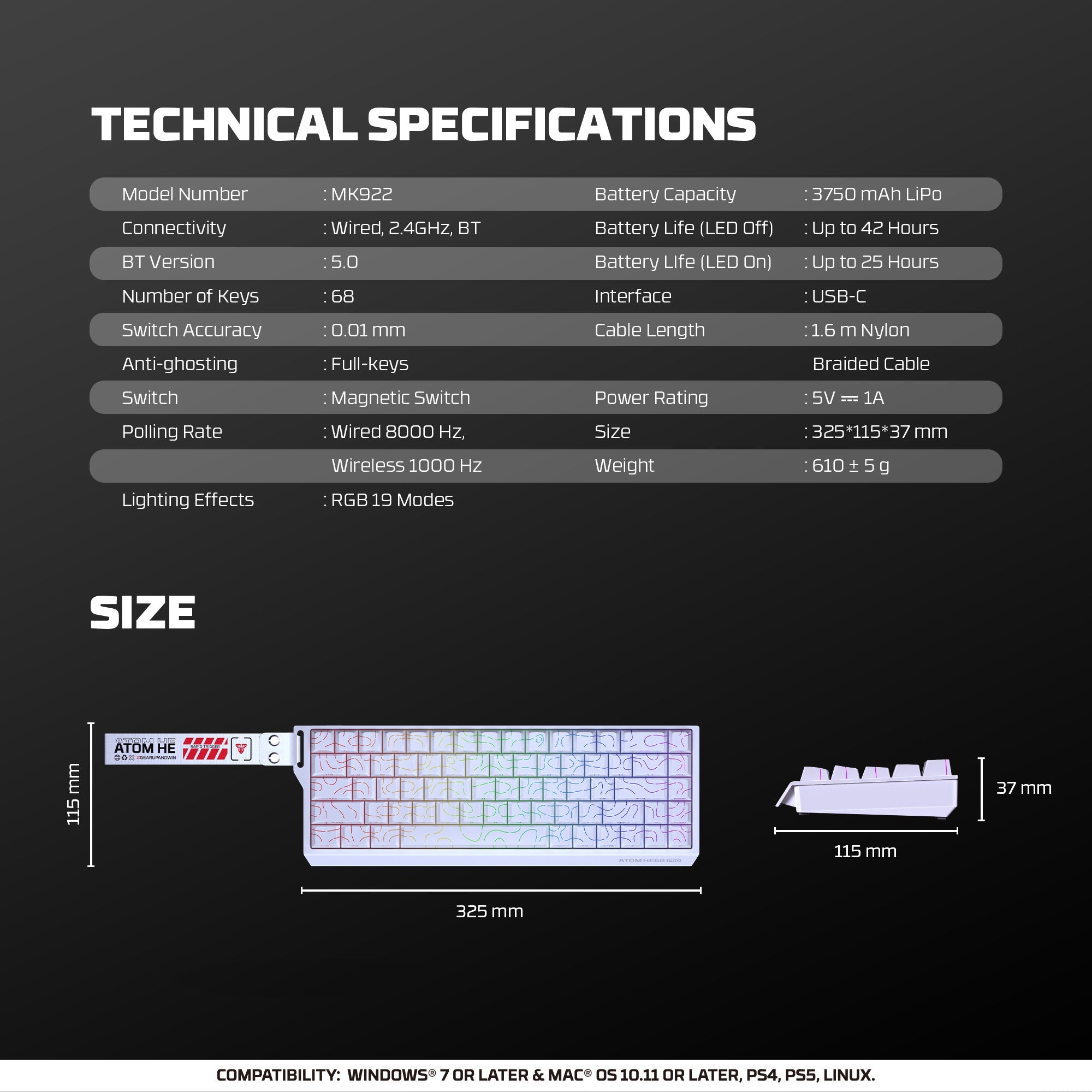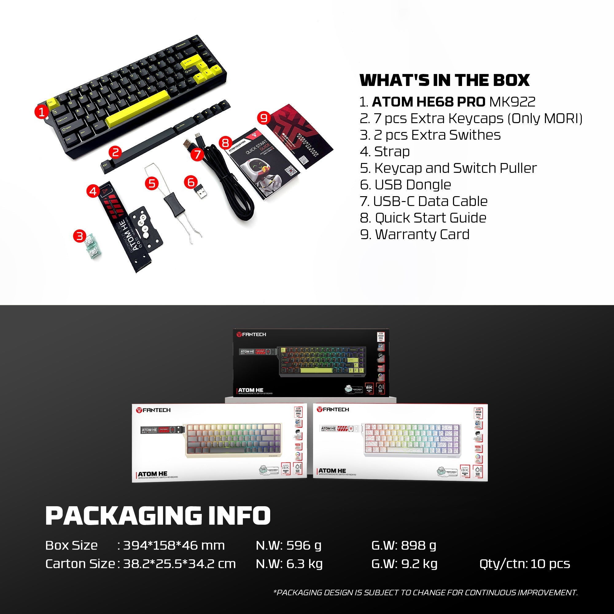 Fantech ATOM HE68 PRO MK922 عبارة عن لوحة مفاتيح ميكانيكية لاسلكية مدمجة بنسبة 65% تتميز بمفاتيح تأثير القاعة المغناطيسية، ومعدل اقتراع سلكي 8 كيلو هرتز، واتصال ثلاثي الأوضاع (سلكي، 2.4 جيجا هرتز، بلوتوث). تتميز بدقة تشغيل 0.01 مم، وأغطية مفاتيح PBT مزدوجة اللقطة، و19 وضع إضاءة RGB، وبطارية 3750 مللي أمبير في الساعة، مما يجعلها مثالية للألعاب التنافسية والأداء القابل للتخصيص.